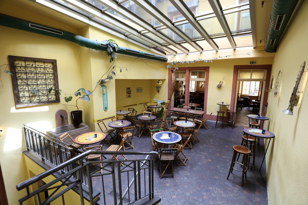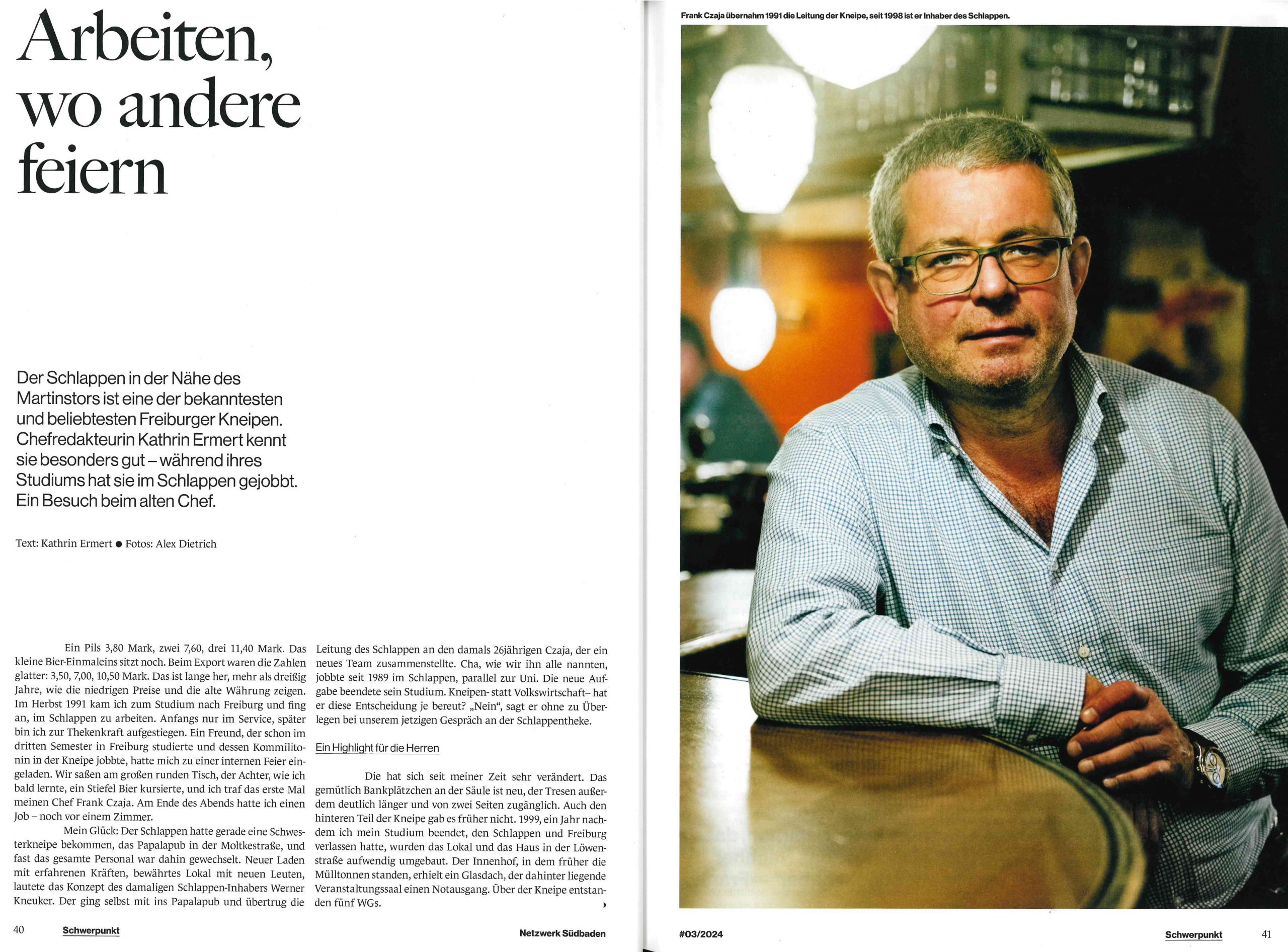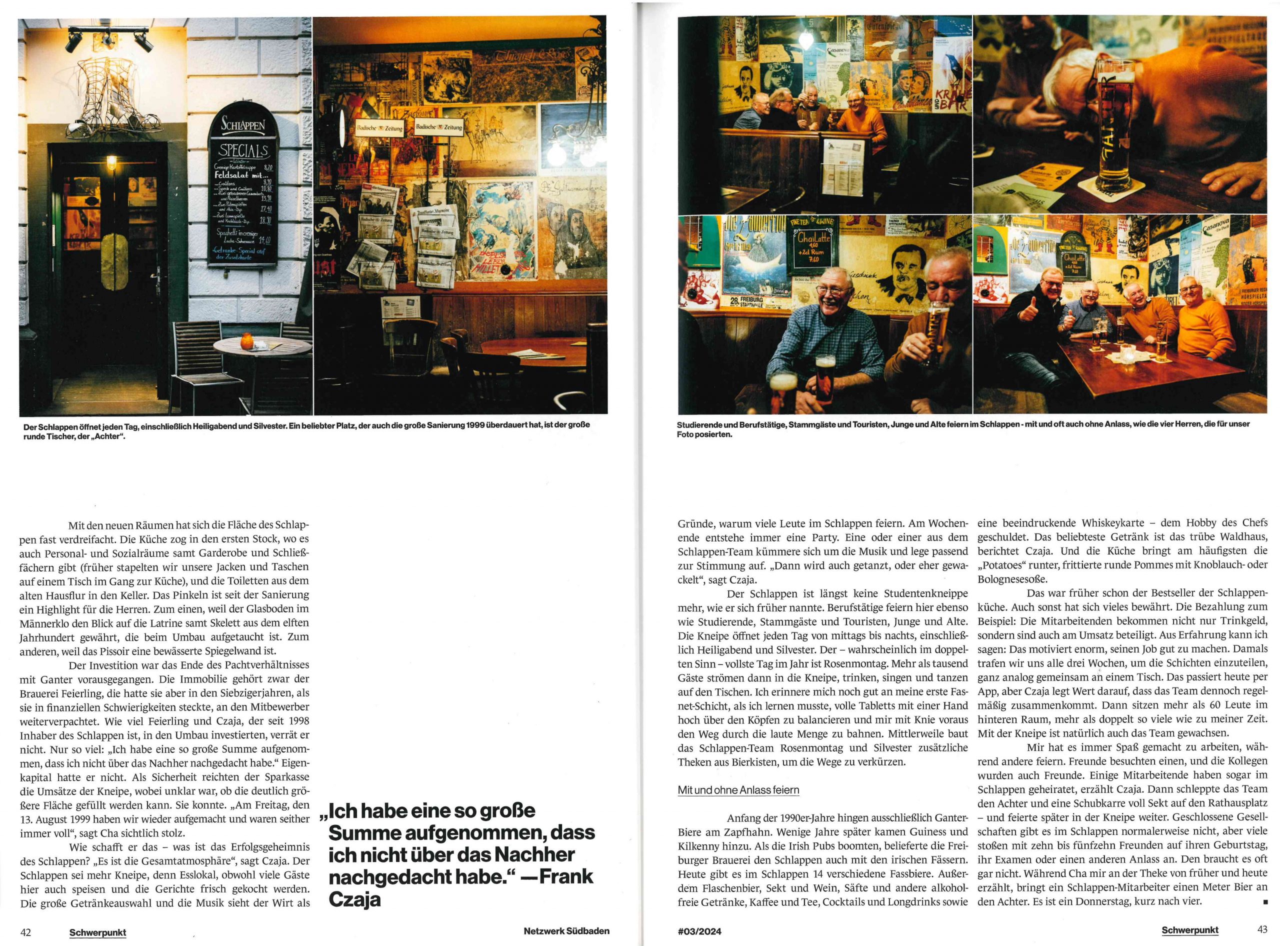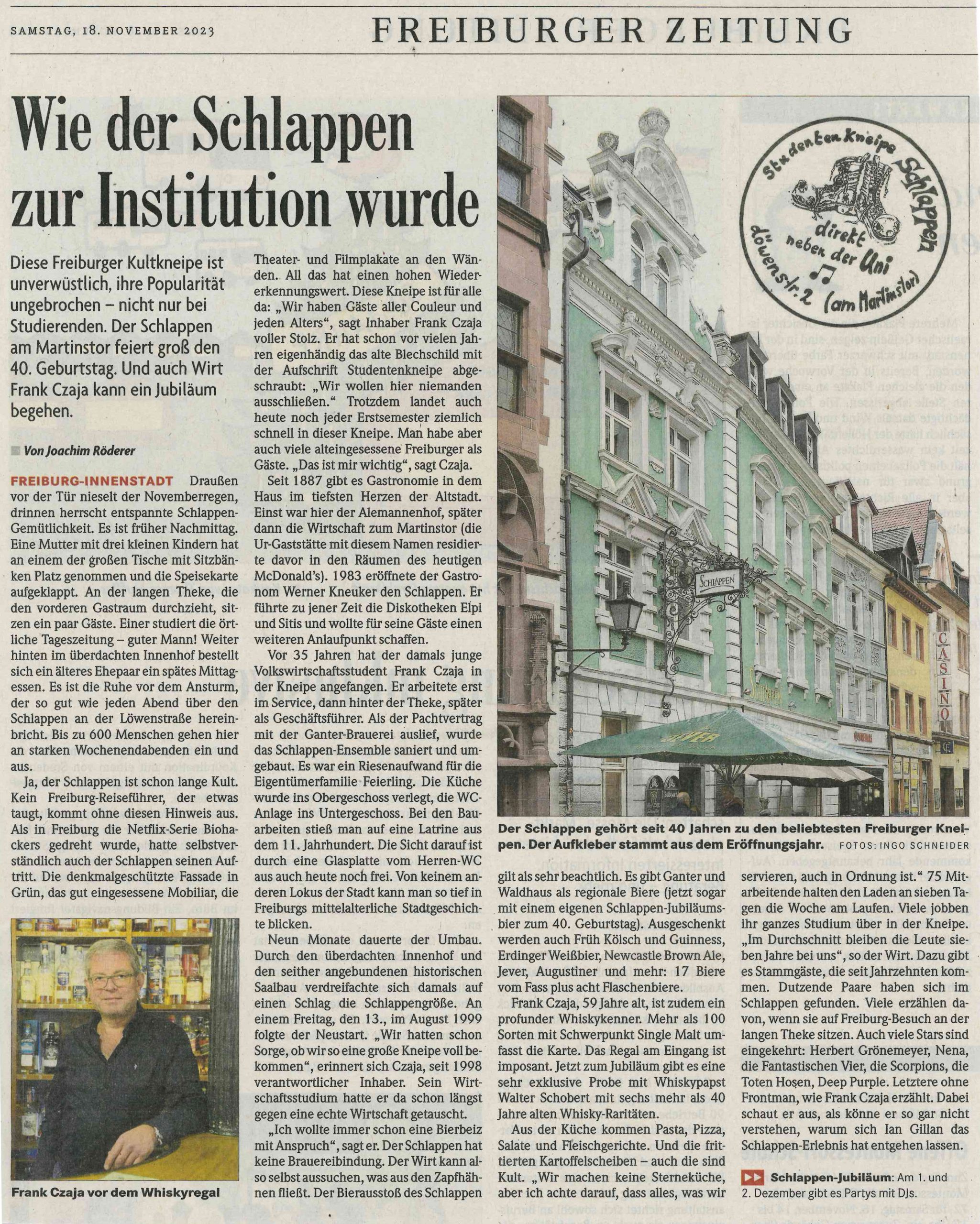 Wenn Wände sprechen könnten, dann würden sie vielleicht das Geheimnis preisgeben, warum seit Jahrzehnten Scharen von Studenten den „Schlappen“ aufsuchen. Dann würden sie unendlich viele Geschichten und Ereignisse erzählen können, die sich innerhalb des historischen Gebäudes mit Latrine aus dem 11. Jahrhundert, zwischen antikem Mobiliar und antiquierten Theaterplakaten abgespielt haben. Jahrein, jahraus. Aber Wände sind bekanntlich stumm. Es ist sicher nicht nur der Charme der vergangenen Jahre, der dem Schlappen anhaftet, sondern gerade das pulsierende Leben, das sich in den drei Gasträumen tagtäglich abspielt. Dann, wenn die Schwingtür aufgeht und die Gäste in die Kneipe strömen. Von vormittags bis spät in die Nacht, an 365 Tagen im Jahr. Hier bedienen Studenten überwiegend Studenten, oder die die es einmal waren, bei ausgewählter musikalischer Untermalung. Es mag gerade diese individuelle Atmosphäre sein, die man mittags zum Essen als Alternative zur Mensa sucht, hier Kaffee mit Lektüre verbindet oder abends bei Bier oder Wein erlebt, wenn sich der Schlappen zum brodelnden Schmelztiegel verwandelt!
